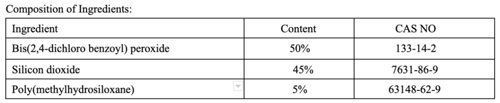 It has 50% active ingredient in white or slight yellow paste or powdered form, which is used as a cross linking agent of silicone rubber.